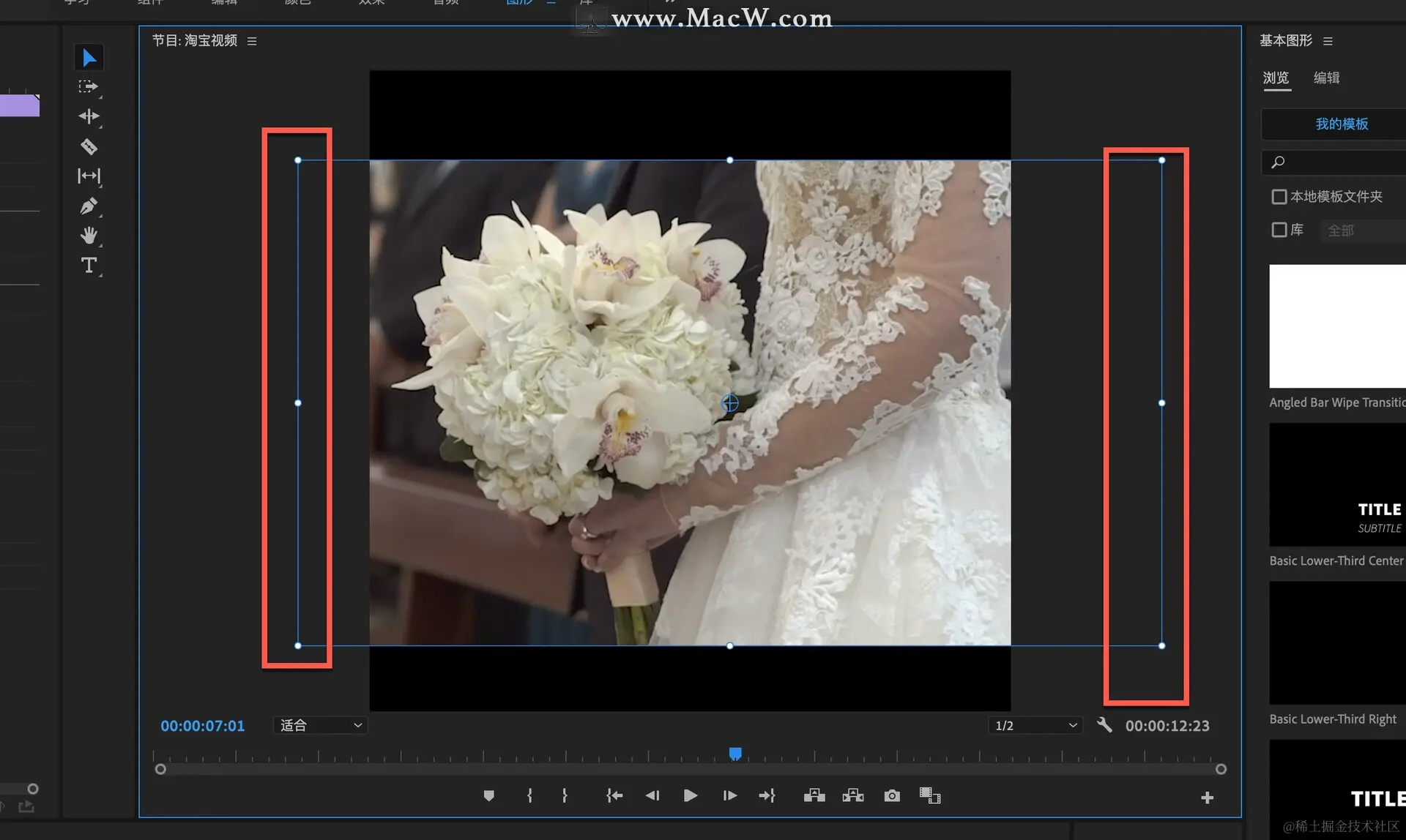 视频左右两边出现控制框,用鼠标左键拖动控制框将画面主体放到中间位置