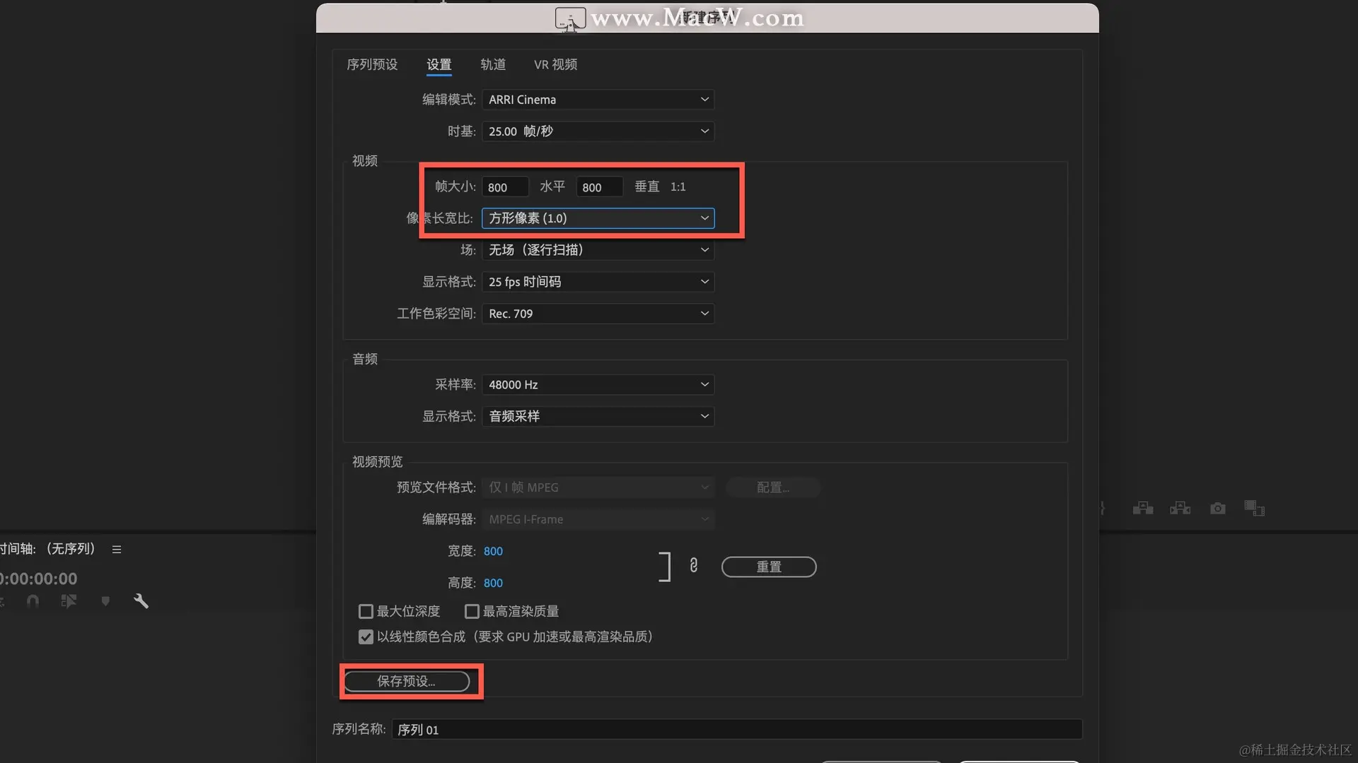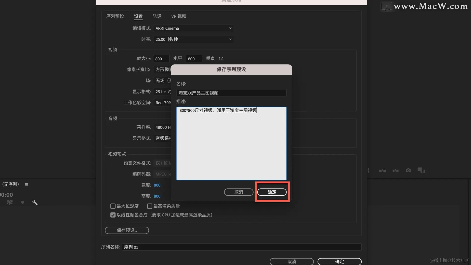 例如我们要做淘宝主图视频,就在帧大小中改为800*800,下方像素长宽比改为方形像素,点击左下角的保存预设...