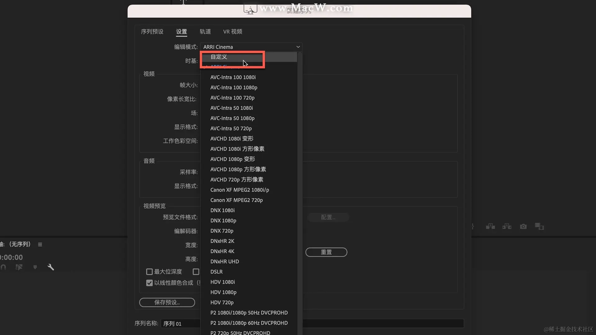 在新建序列窗口中,把编辑模式改为自定义