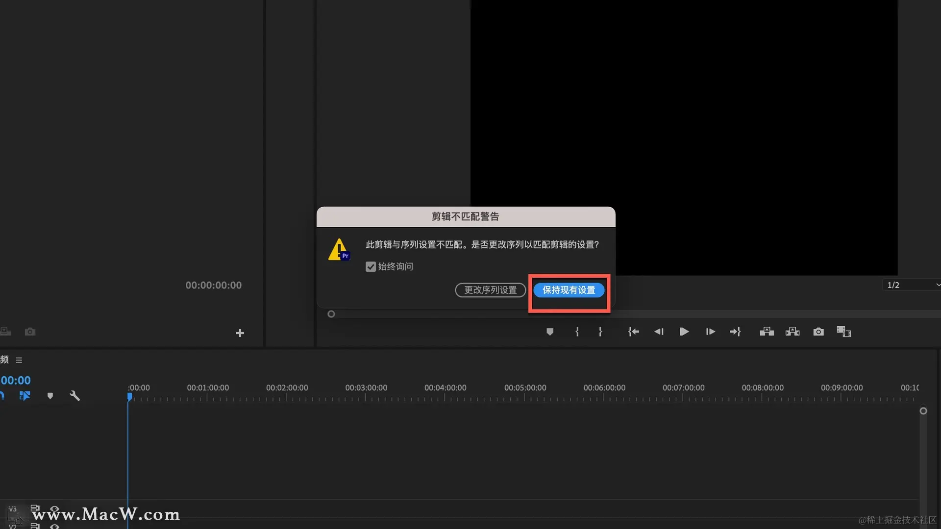 现在可以添加需要的视频,但是由于视频尺寸与预设尺寸不同,会弹出以下提示,可以先点击保持现有设置