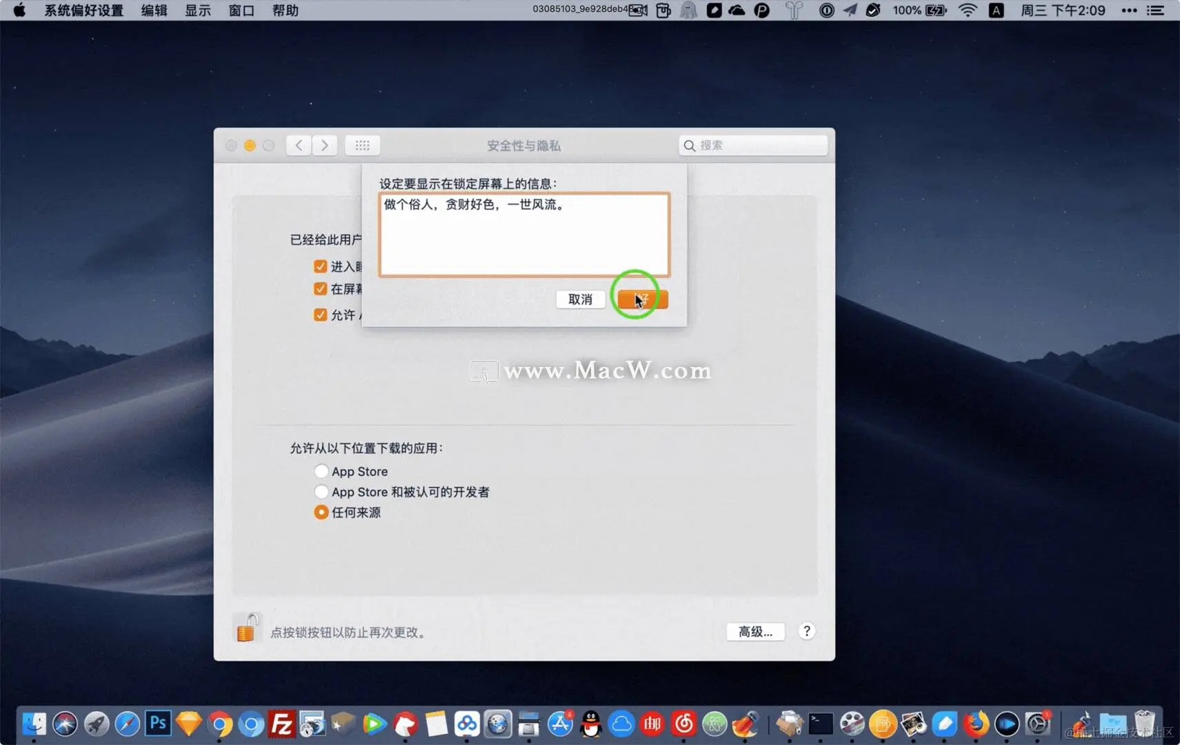」->「系统偏好设置」->「安全与隐私」->「小锁」->勾选「在屏幕锁定时显示信息」->设定「锁定信息」->输入你的内容