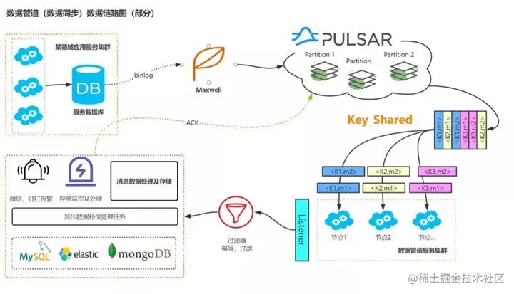 在需要同步大量增量数据的场景下,我们采用了 Maxwell + Pulsar 的自研解决方案,Pulsar Key_Shared 订阅模式能否很好解决分布式消息消费过程中的顺序问题,在数据管道数据链路中增设过滤器,能保证消息不重不漏。