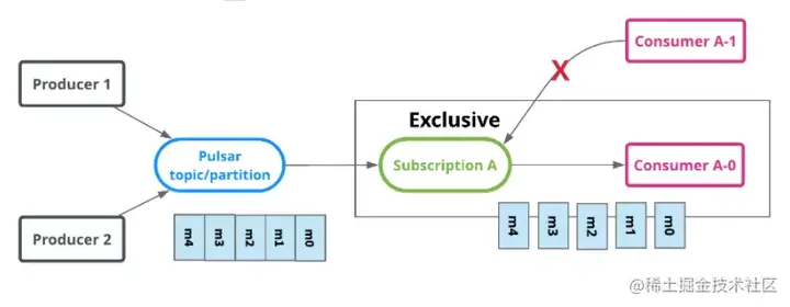 首先,我们了解一下 Pulsar 的订阅模式。Pulsar 有四种订阅模式:exclusive 模式(独占模式)、failover 模式 (故障转移模式)、Shared 模式 (共享模式)以及 Key_Shared 模式。Exclusive 模式只有一个消费者(consumer),接收一个 Topic 所有的消息。