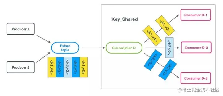 Pulsar 在 2.4.0 版本基于 Shared 模式推出了 Key_Shared 模式。在 Key_Shared 模式下,多个消费者可以附加到同一订阅。消息在各个使用者之间进行分发,具有相同 key 或相同订购 key 的消息仅投递给一位消费者,不管消息重新发送多少次,它都会被发送到同一使用者。当消费者连接或断开连接时,服务的消费者会更改某些消息 Key(密匙)。Key_Shared 模式保证在 Shared 模式下同一个 Key 的消息会发送到同一个消费者,在并发的同时保证顺序性。