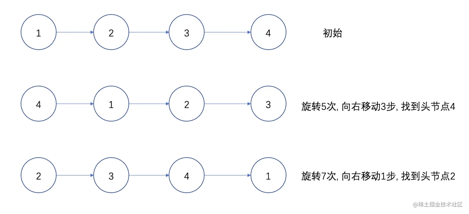 拿到这题,第一反应就是,找到链表倒数第二个节点,然后将倒数第二个节点的指针指向null,将最后一个节点的指针指向头节点,循环k次即可。