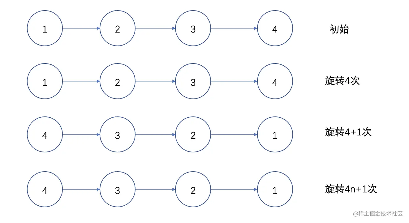 旋转次数为k, 那么实际旋转次数为(k/链表长度)得到的余数,即k%length