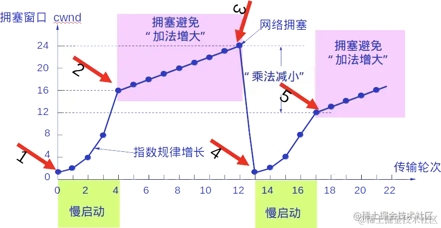 慢开始cwnd指数级增加,改为线性增加避免拥塞。