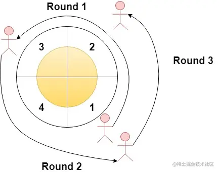 其实思路很简单,就是逆时针在围绕赛道跑,找出经过最多次数的扇区,我们可以将这条圆形赛道拉直看成是条直线赛道,最多可能跑的轮数是 len(rounds) ,假如我们 n=4 , rounds = [2,3,1,2] ,我们可以将赛道变成如下形式: