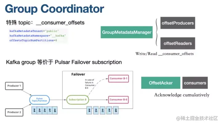 KoP 这里也做了一些配置,这个特殊的 topic 会存在于一个默认的 namespace 下,它的 partition 数量默认是 8。Kafka group 基本等价于 Pulsar Failover subscription。如果想让 Kafka 的 Offset 被 Pulsar 客户端识别的话,就需要 Offset 对应的 MessageId 进行 ACK。因此 KoP 里面有个组件是叫 OffsetAcker,它维护了一组 Consumer。每次 Group Coordinator 要进行 ACK 时,就会创建一个 partition 对应的 consumer 来把 group ACK。