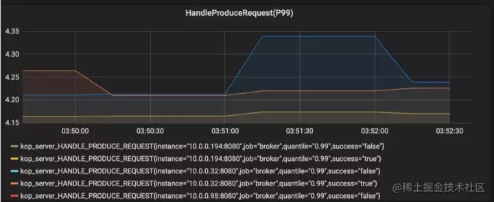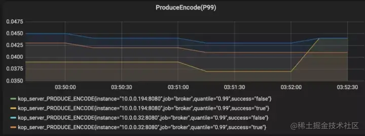 我们主要看编码 ProduceEncode (对 Kafka 消息编码的时间)的时间,我的测试是用 Kafka 的 EntryFormat,可以看到只消耗不到 0.1 ms 的时间;如果用 Pulsar 的 EntryFormat,那么监控结果在零点几 ms ~ 几 ms 之间。