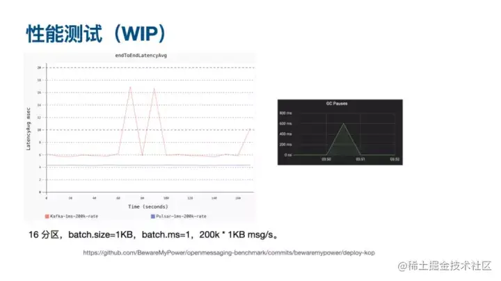 性能测试还处于 WIP(Work in Progress)阶段,目前发现了一些问题。首先,在下图图峰中,端到端延时为 6ms 对 4ms,该时间在可接受范围内。但是在后续排查中,我发现经常出现 full GC 高达 600 ms 的情况,甚至出现延时更高的情况,我们在排查这个问题。