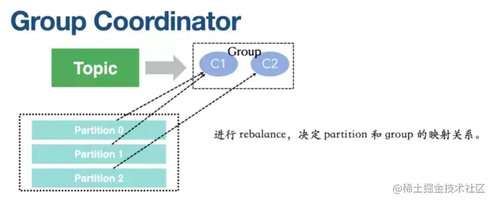 Group Coordinator 是用来进行 rebalance,决定 partition 和 group 的映射关系。因为 Group 会有多个消费者,消费者会访问哪些 partition,这个就是由 Group Coordinator 来决定的。