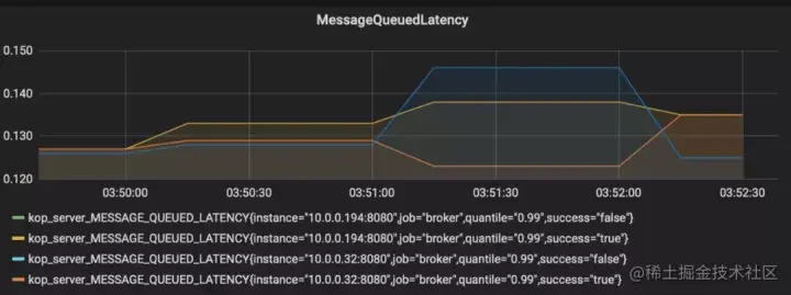 其实这里的实现还存在一点问题,因为目前还在用一个队列,所以会有下图的指标 MessageQueuedLatency。MessageQueuedLatency 是从每个分区的消息队列开始,到准备异步发送的时间。我们怀疑是不是队列导致性能变差,但是从监控来看 0.1 ms 的延时影响不大。