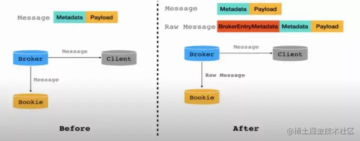 上图左侧:目前 Pulsar 消息组成包括 Metadata 与 Payload 两部分,Payload 指的是具体写入的数据,Metadata 则是元数据如发布时间戳等。Pulsar Broker 会将消息写入 Client,同时将消息存到 Bookie 中。