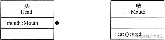 在 UML 类图中,组合关系用带实心菱形的实线来表示,菱形指向整体。图 7 所示是头和嘴的关系图。