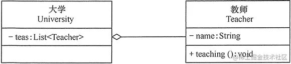在 UML 类图中,聚合关系可以用带空心菱形的实线来表示,菱形指向整体。图 6 所示是大学和教师的关系图。