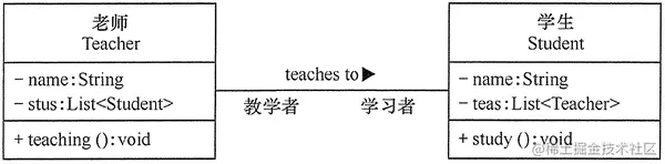 在代码中通常将一个类的对象作为另一个类的成员变量来实现关联关系。图 5 所示是老师和学生的关系图,每个老师可以教多个学生,每个学生也可向多个老师学,他们是双向关联。