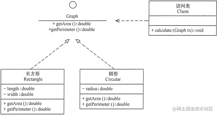 类图中的类可以通过某种编程 语言直接实现。类图在软件系统开发的整个生命周期都是有效的,它是面向对象系统的建模中最常见的图。图 3 所示是“计算长方形和圆形的周长与面积”的类图,图形接口有计算面积和周长的抽象方法,长方形和圆形实现这两个方法供访问类调用。