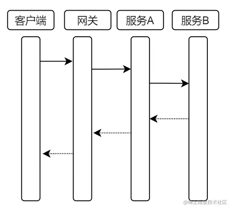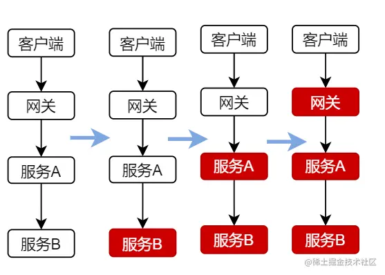 还是上面的一个熟悉场景,正常的 客户端 – 网关 – 服务A – 服务B 请求过程中,上面展示了三个阶段,这也是服务雪崩一般的 3 个阶段