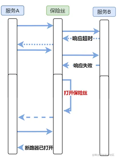 如上图,服务 A 访问 服务 B 的过程中,中间加了一个保险丝,也就是一个断路器,