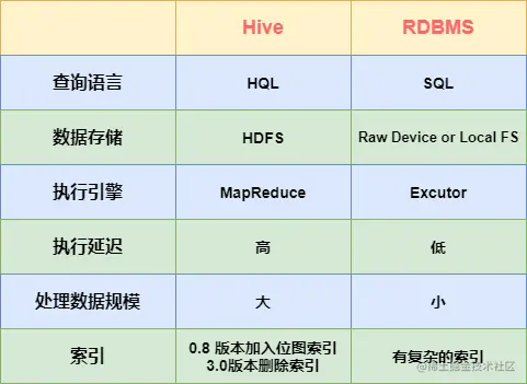 - 数据存储位置。Hive 是建立在 Hadoop 之上的,所有 Hive 的数据都是存储在 HDFS 中的。而数据库则可以将数据保存在块设备或者本地文件系统中。