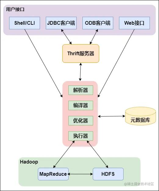 用户接口:包括CLI、JDBC/ODBC、WebGUI。其中,CLI(command line interface)为shell命令行;JDBC/ODBC是Hive的JAVA实现,与传统数据库JDBC类似;WebGUI是通过浏览器访问Hive。