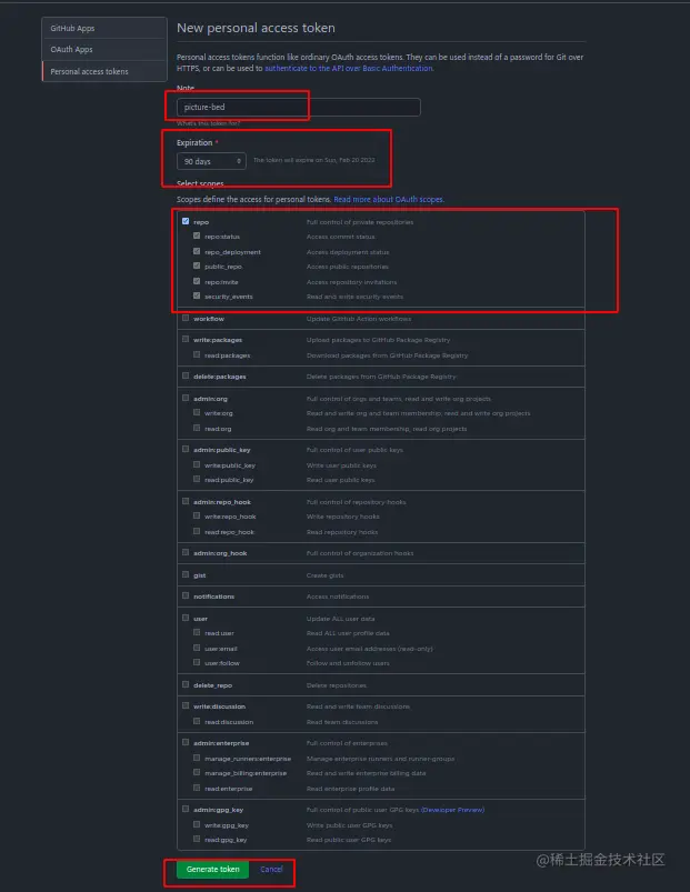 设置Note、Expiration、Select scopes