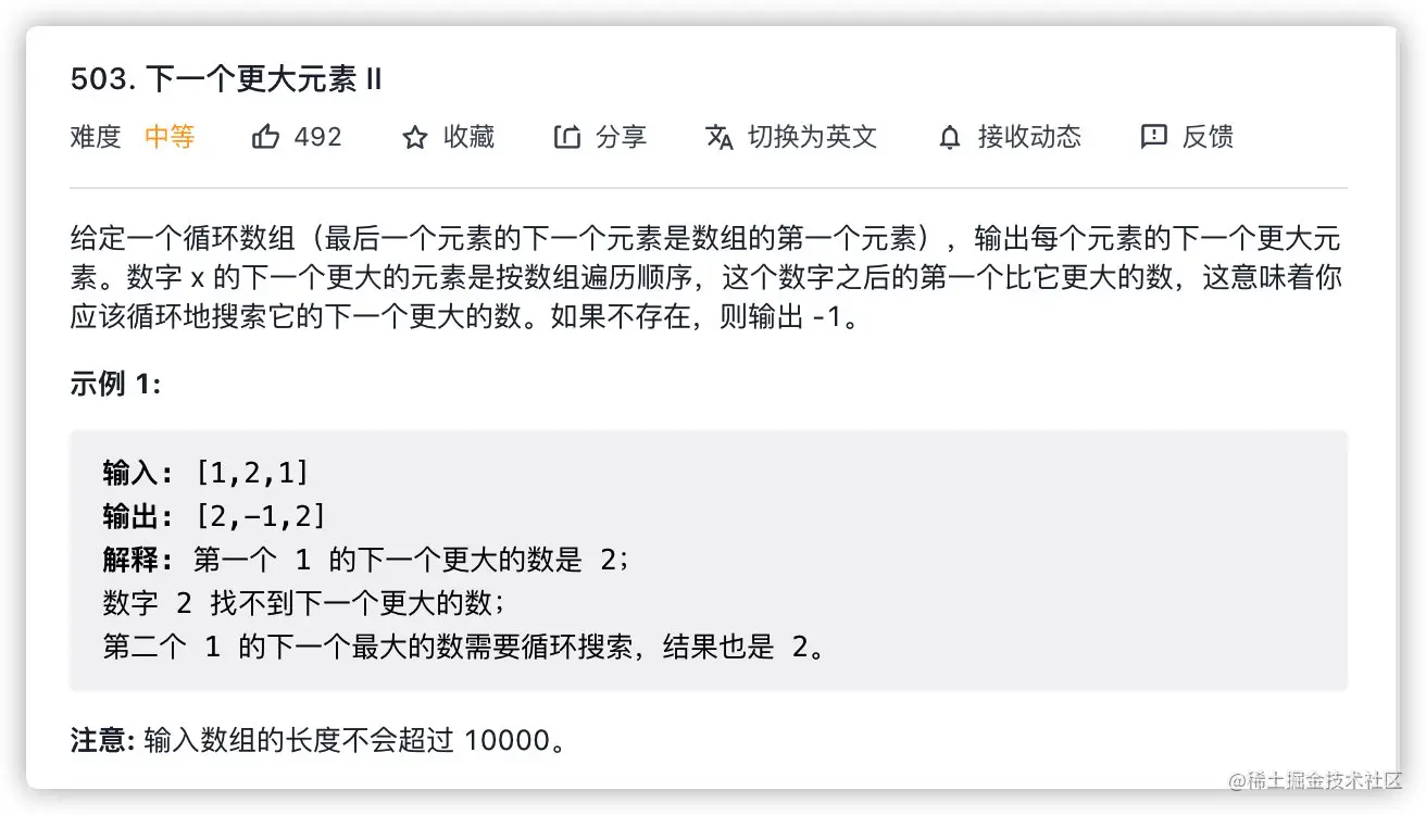 有同学会问了,for 循环 + while 循环,这时间复杂度不还是 O(N^2) 吗? 其实不然,虽然有 while 循环,但是从整体来看共有 n 个元素,每个元素都被 push 入栈了一次,而最多会被 pop 一次,没有任何冗余操作。所以总的计算规模是和元素规模 n 成正比的,也就是 O(n) 的复杂度。