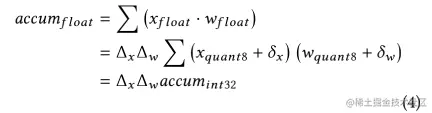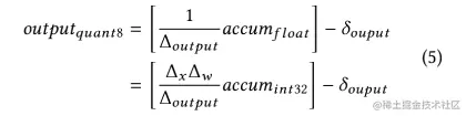 最后,给定输出的已知的最大值和最小值,将上述 (1)-(4) 公式结合起来,反量化得到的输出可以通过下述公式计算得到: