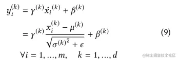 假设 x 是每层的输入,它包括 d 个通道,每个 batch 的大小是 m,则在深度卷积中 BN 是独立的在每个通道中进行转换,其计算公式如下: