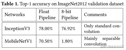 为了上述说的量化问题,作者使用 TensorFlow 框架来实现了 MobileNetV1 和 InceptionV3,并对比浮点模型和量化后顶点模型的准确率,如下图所示,可以看到 InceptionV3 的准确率在量化后并没有下降太多,反倒是 MobileNetV1 量化后的准确率大幅度下降,作者也给出对两个网络的评价,前者是只有标准卷积,而后者主要用了可分离卷积。