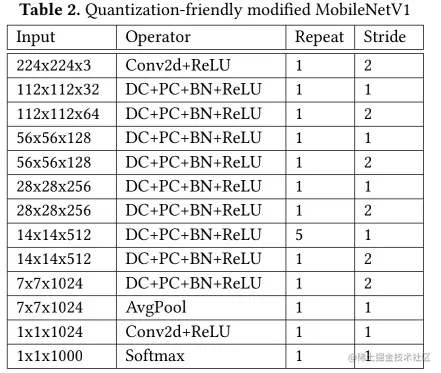 最终本文提出的量化友好的 MobileNetV1 的网络结构如下表所示,在移除了深度卷积的 BN 和 ReLU6 后,该网络结构还保留原有的降低计算损失和模型大小的优点,并且能让量化模型的精度和浮点模型接近。