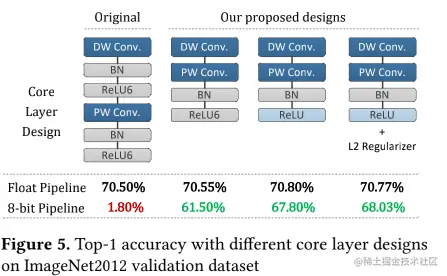 基于上述的原则,本文是考虑移除了深度卷积后的 BN 和 ReLU6,让深度卷积来学习合适的权重从而替代了 BN 的作用,这样的操作即可以保持特征的表征能力,又使得模型能很好实现量化操作。