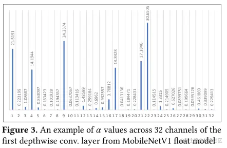 此外,没有跨通道的修正操作,深度卷积很可能在一个通道里产生全 0 的数值,这导致该通道的方差是 0,并且这种情况在 MobileNetV1 种是很常见的。而根据公式(10),方差是 0 的时候由于设置的非常小的常数 , 会非常大,如下图所示,测量了32 个通道中的 数值,由于零方差导致的 6 个离群点 是增大了量化范围,这导致的结果就是量化位数会由于要保持这些来自全 0 通道的巨大的数值而浪费了,相反那些带有信息的通道的较小的 反而没有被保留下来,使得整个模型的表征能力变差很多。