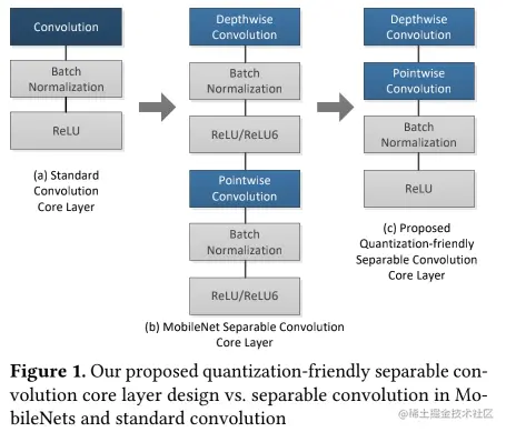 如下图 c 所示即为作者提出的新的分离卷积层,这包含了 3 个主要的改变来使得可分离卷积变得量化友好: