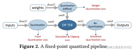 本节将研究基于 TensorFlow(TF) 实现的 8bit 量化的 MobileNetV1 模型在定点 pipeline 中精度损失的根因,下图展示了一个经典的 8bit 量化流程。一个 TF 的 8bit 量化模型首先是直接从预训练的浮点模型中生成,其权重首先是离线量化的,然后在推理阶段,所有的浮点输入都先量化为一个 8bit 的无符号数值,然后再传到一个顶点的运行时操作,比如 QuantizedConv2d, QuantizedAdd, QuantizedMul 等,它们会生成 32 位的累计结果,然后通过激活反量化(activation re-quantization)步骤转成一个 8bit 的输出,然后这个输出再传给下一个操作。
