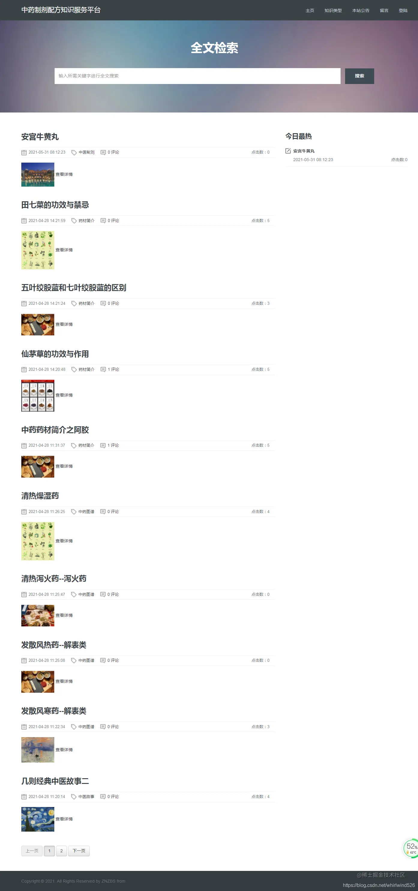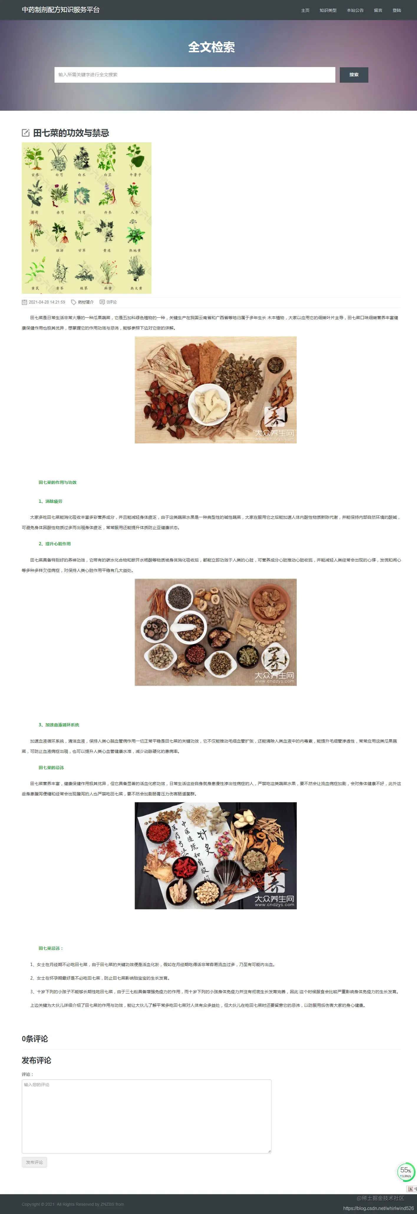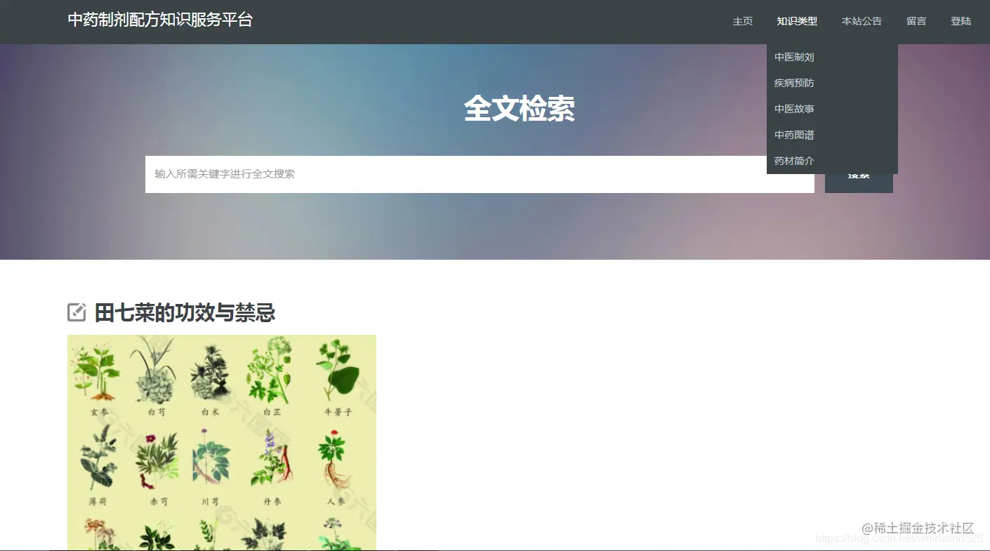 本项目是为一位客户定制开发的毕业设计项目,他的选题是基于中药制剂相关的科普知识型网站系统。目前中药作为传统医学,在抗击疫情时起到了很重要的作用,也受到了国家层面的高度重视,未来规划中重点发展中医体系统建设,倡导传统文化,也是民族复兴,提升国民民族自豪感的一项重要举措。所以从这个角度来看,这个项目的选题也比较新颖的,也获得了答辩评委的一致好评。