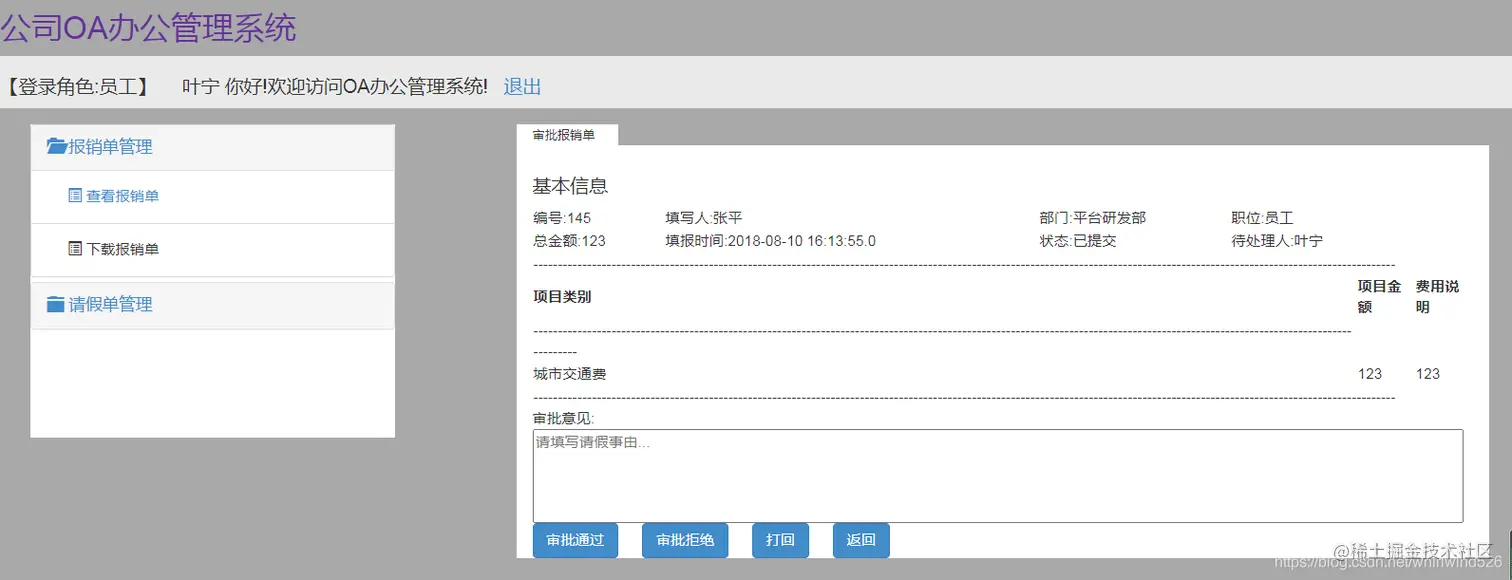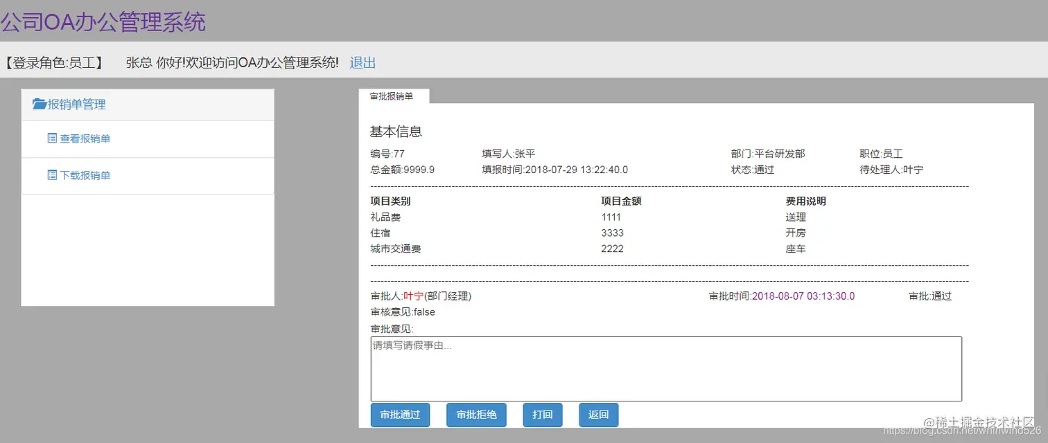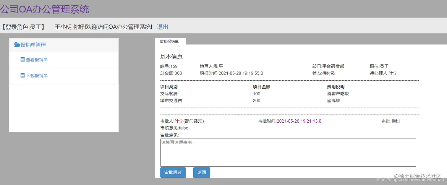 本项目基于Springboot框架开发实现,主要实现一个公司内部OA办公系统,具体功能主要体现两个核心业务模块,一个是员工的出差报销流程,一个是员工的请假批复流程。系统共分为五个角色:员工,部门主管,财务人员,总经理和人事部门主管经理。