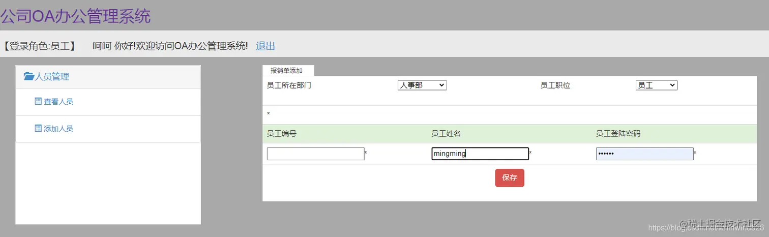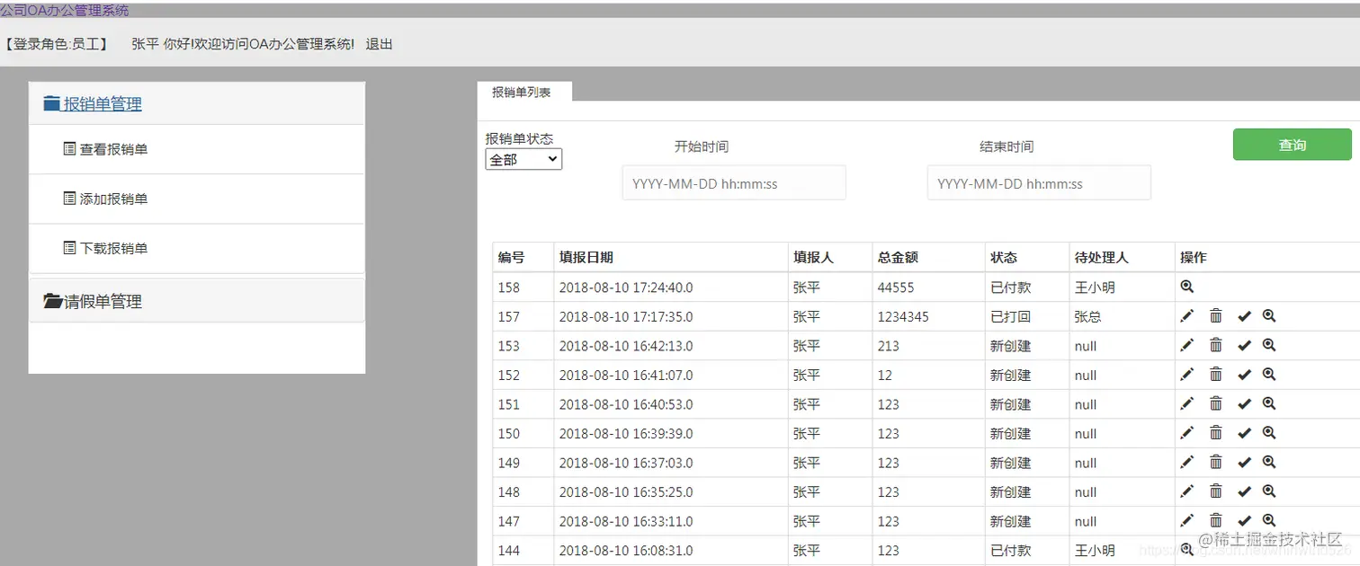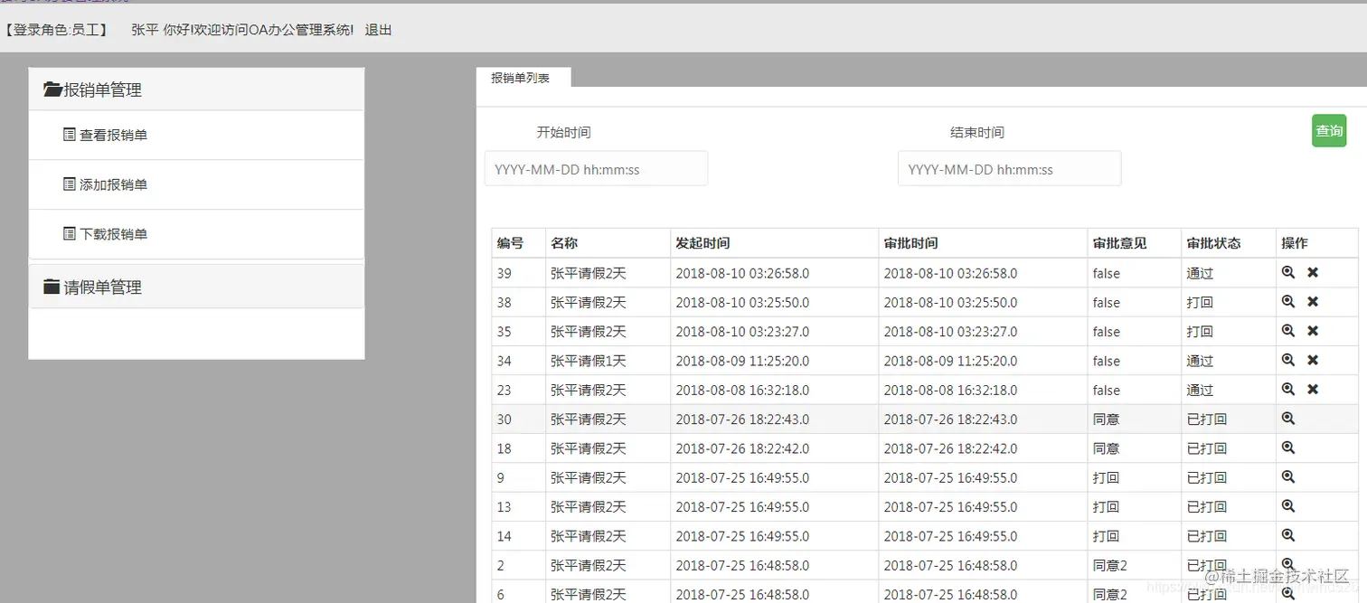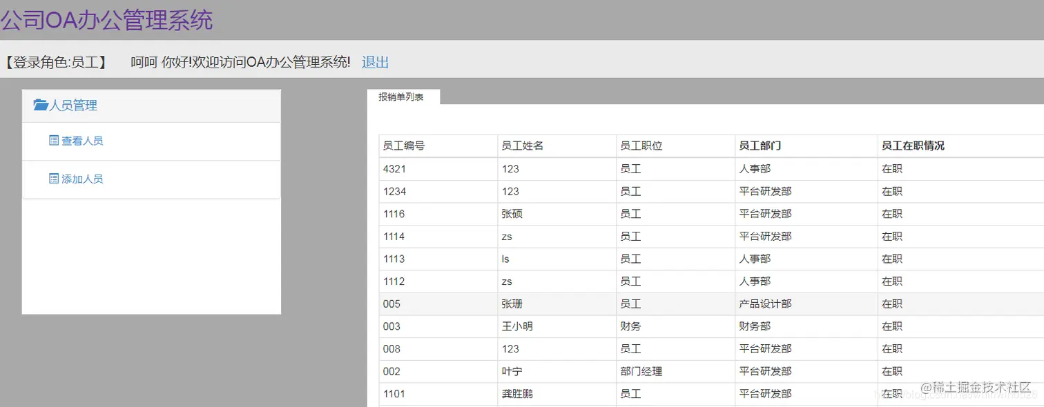 本项目基于Springboot框架开发实现,主要实现一个公司内部OA办公系统,具体功能主要体现两个核心业务模块,一个是员工的出差报销流程,一个是员工的请假批复流程。系统共分为五个角色:员工,部门主管,财务人员,总经理和人事部门主管经理。