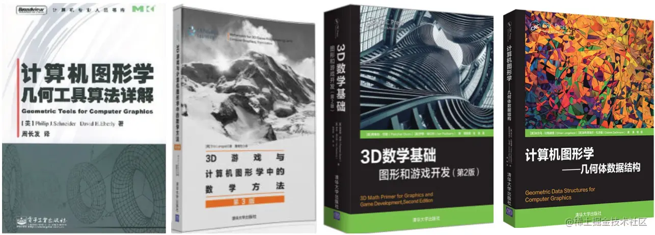 3D 数学基础方面推荐3Blue1Brown的视频:线性代数的本质,B 站上有中文字幕和翻译。 除了视频,还有下面几本书值得学习,需要注意的是,普通开发者并不需要完全掌握书上的全部内容,了解基础知识更重要: