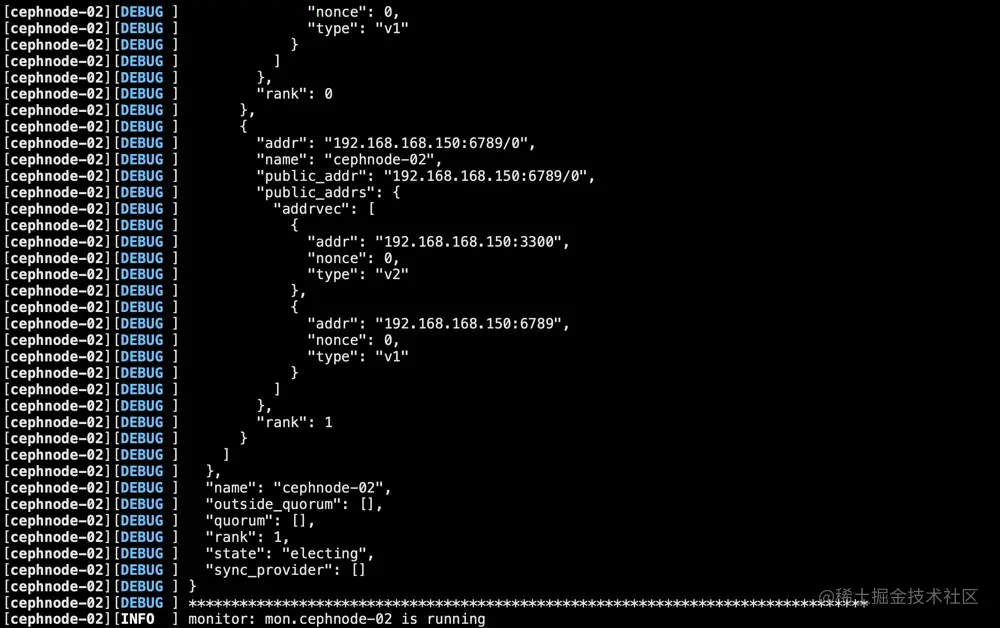 至此,monitor扩容完毕,生产中一般部署3个或者5个节点的Monitor,确保集群高可用状态