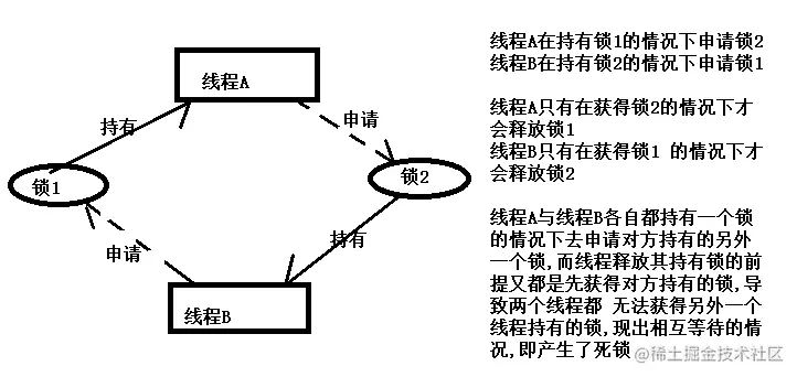如果两个或者更多的线程因相互等待而被永远暂停,我们就称这些线程产生了死锁。