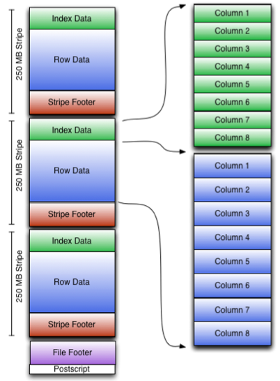 每个文件有一个File Footer,这里面存的是每个Stripe的行数,每个Column的数据类型信息等;每个文件的尾部是一个PostScript,这里面记录了整个文件的压缩类型以及FileFooter的长度信息等。在读取文件时,会seek到文件尾部读PostScript,从里面解析到File Footer长度,再读FileFooter,从里面解析到各个Stripe信息,再读各个Stripe,即从后往前读。