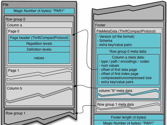 通常情况下,在存储Parquet数据的时候会按照Block大小设置行组的大小,由于一般情况下每一个Mapper任务处理数据的最小单位是一个Block,这样可以把每一个行组由一个Mapper任务处理,增大任务执行并行度。Parquet文件的格式如下图所示。