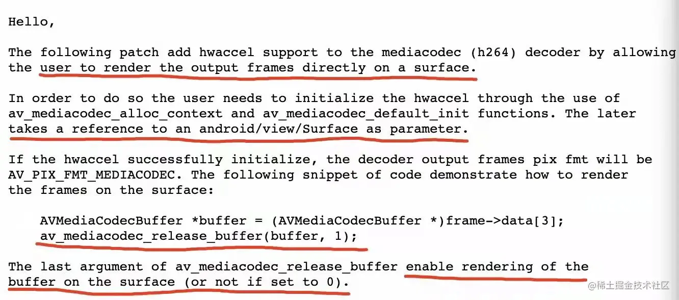 之前介绍的 FFmpeg 调用 MediaCodec 进行硬解码只是解码出了 Buffer 数据,没有把解码到 Surface 上的能力用起来。