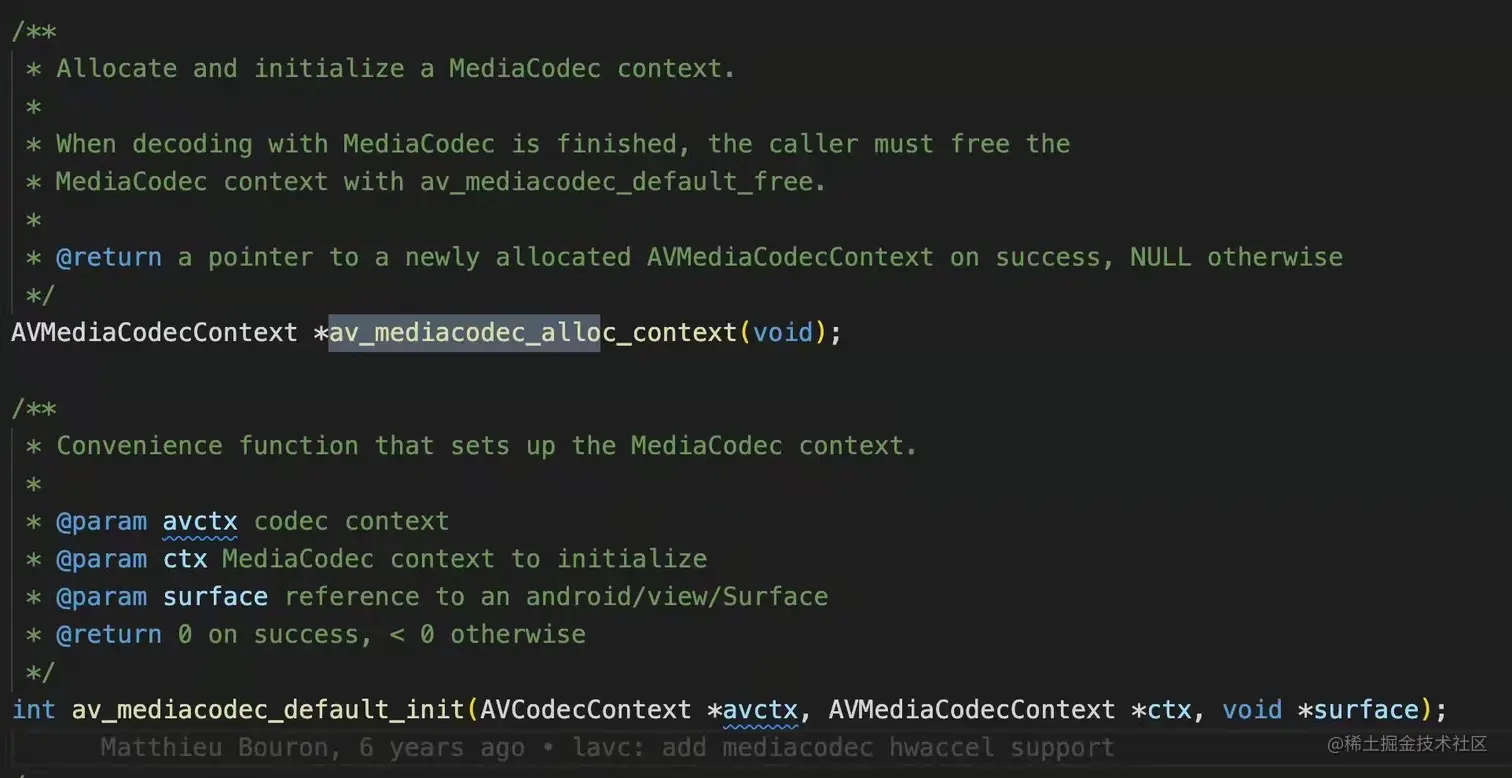 av_mediacodec_alloc_context 和 av_mediacodec_default_init 方法就是让 Surface 和 AVMediaCodecContext 、AVCodecContext 三者之间产生关联。