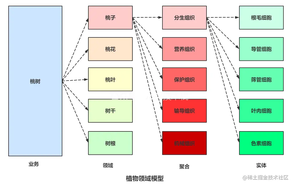 DDD战略设计会建立领域模型, 这四个字放一起会让人觉得很高深, 其实是纸老虎, 通俗来说就是模拟某个领域的的一种模型, 这个模型比较抽象, 但便于人们交流, 举个例子:公园有一棵桃树, 如果我们想好好研究桃树该怎么研究 ?