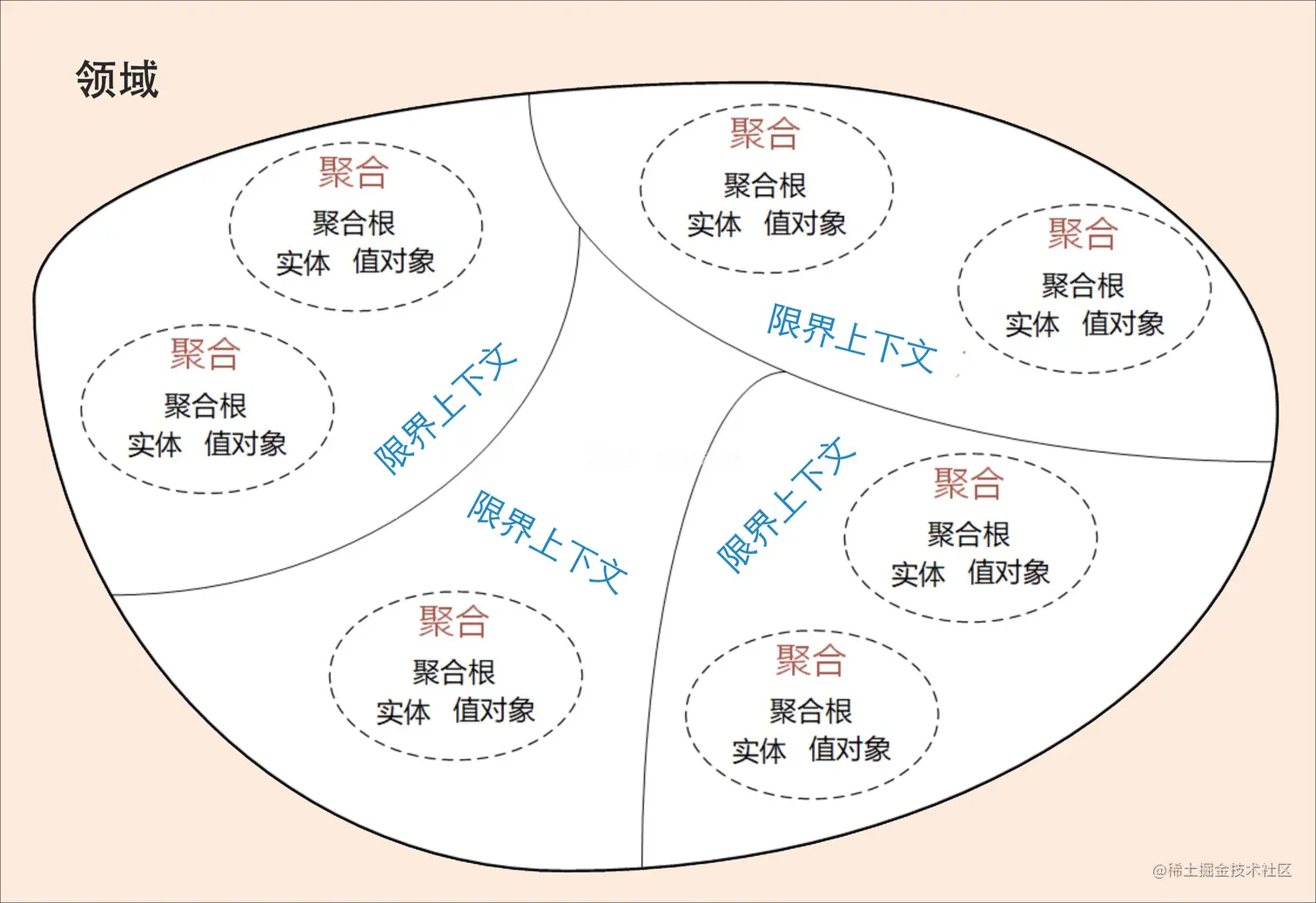 第二步:根据领域实体之间的业务关联性,将业务紧密相关的实体进行组合形成聚合,同时确定聚合中的聚合根、值对象和实体。在这个图里,聚合之间的边界是第一层边界,它们在同一个微服务实例中运行,这个边界是逻辑边界,所以用虚线表示。
