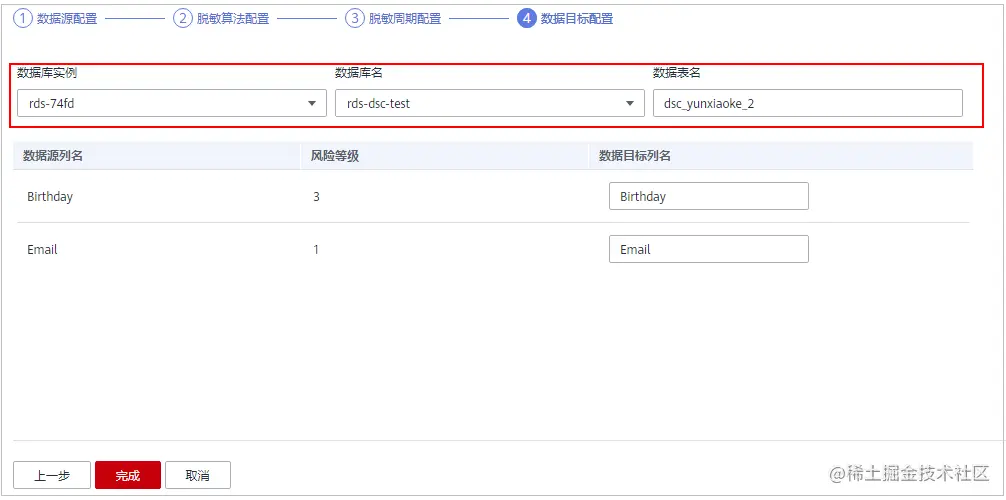 步骤 6 单击“下一步”,进行“数据目标配置”,配置脱敏后生成的表的存放位置。