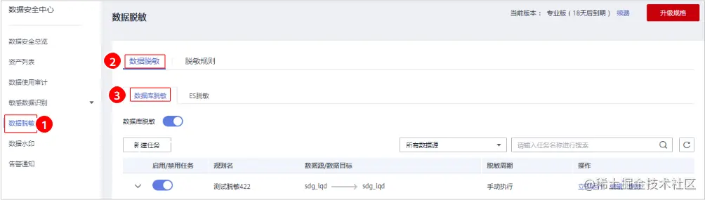 步骤 2 将“数据库脱敏”设置为,开启数据库脱敏。
